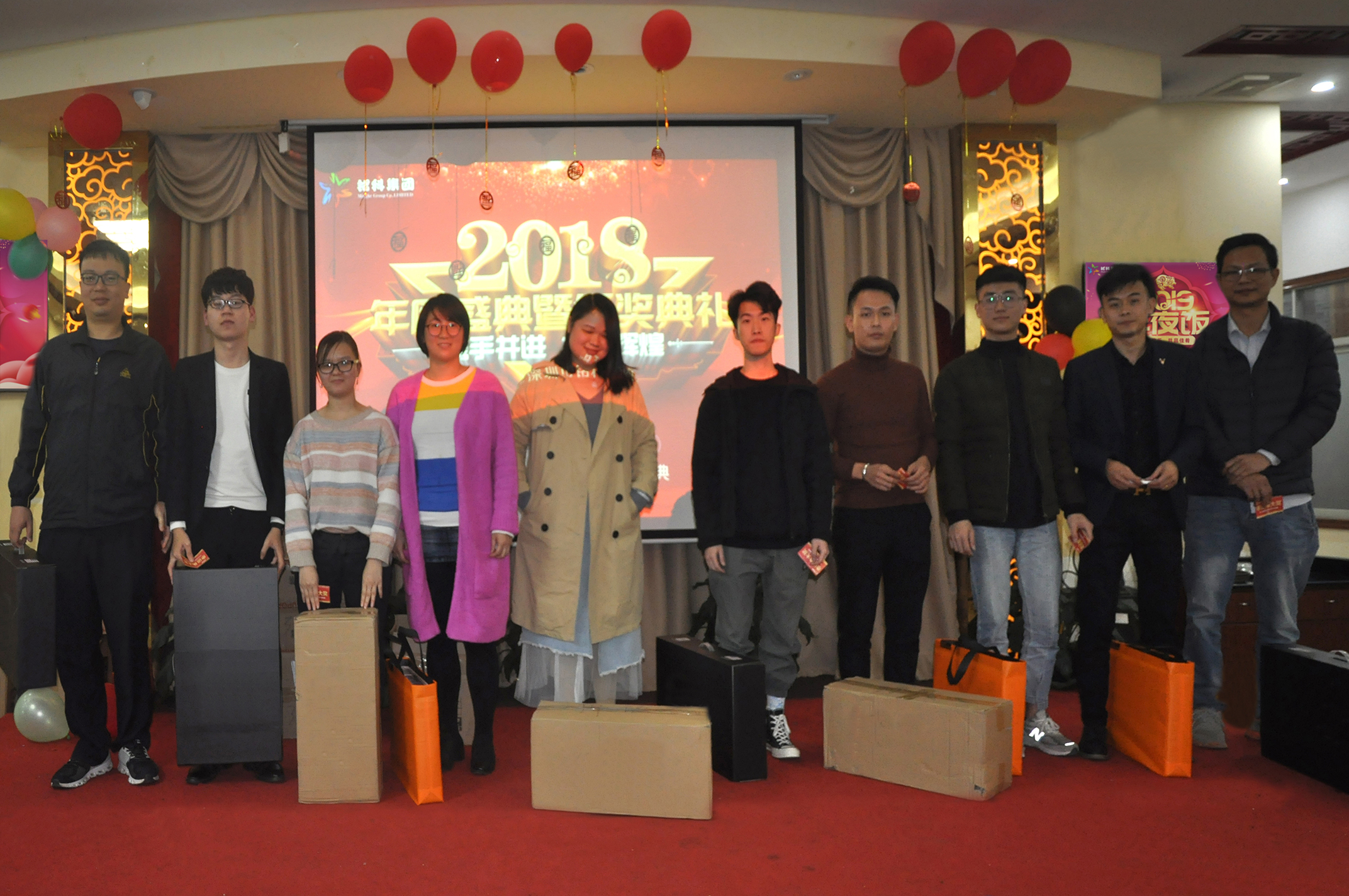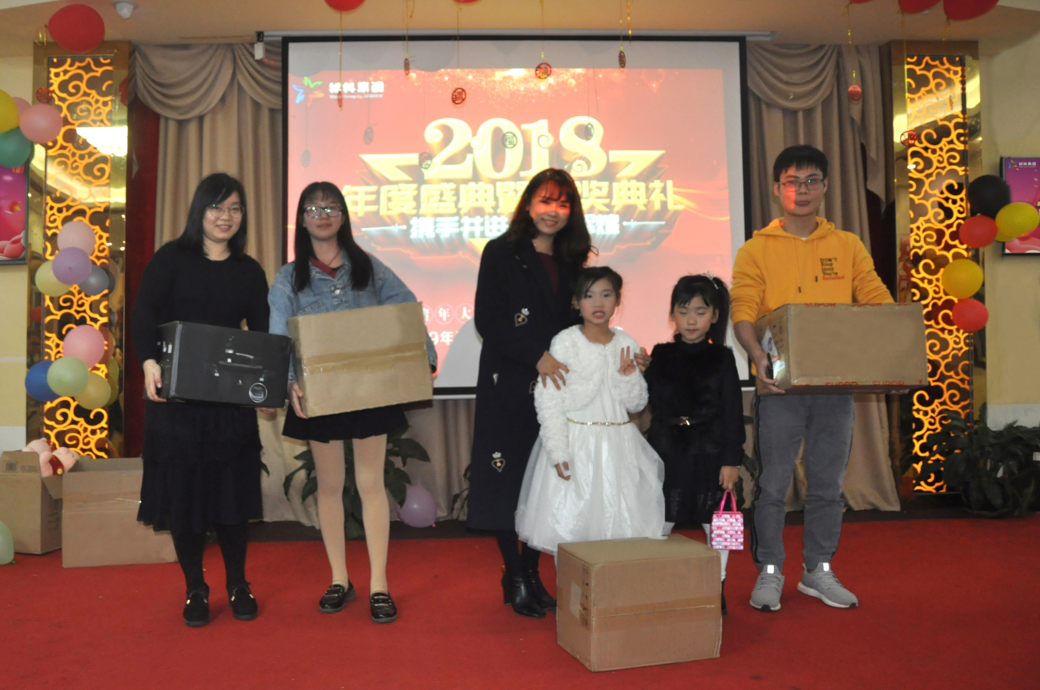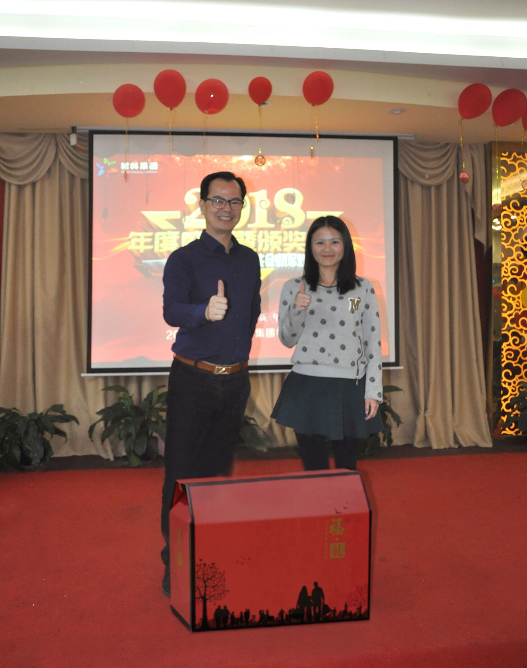 重头戏——抽奖环节来临,各位领导、嘉宾们上台为获奖的同事们颁发奖品,丰厚的奖品将晚会不断推向高潮,大家笑脸盈盈地把大奖都抱回了家。