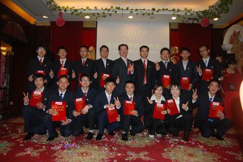“优秀供应商奖”获奖者和陈董事长合照,包括:上海博讯、莱伯泰科、上海智城、上海越平等公司