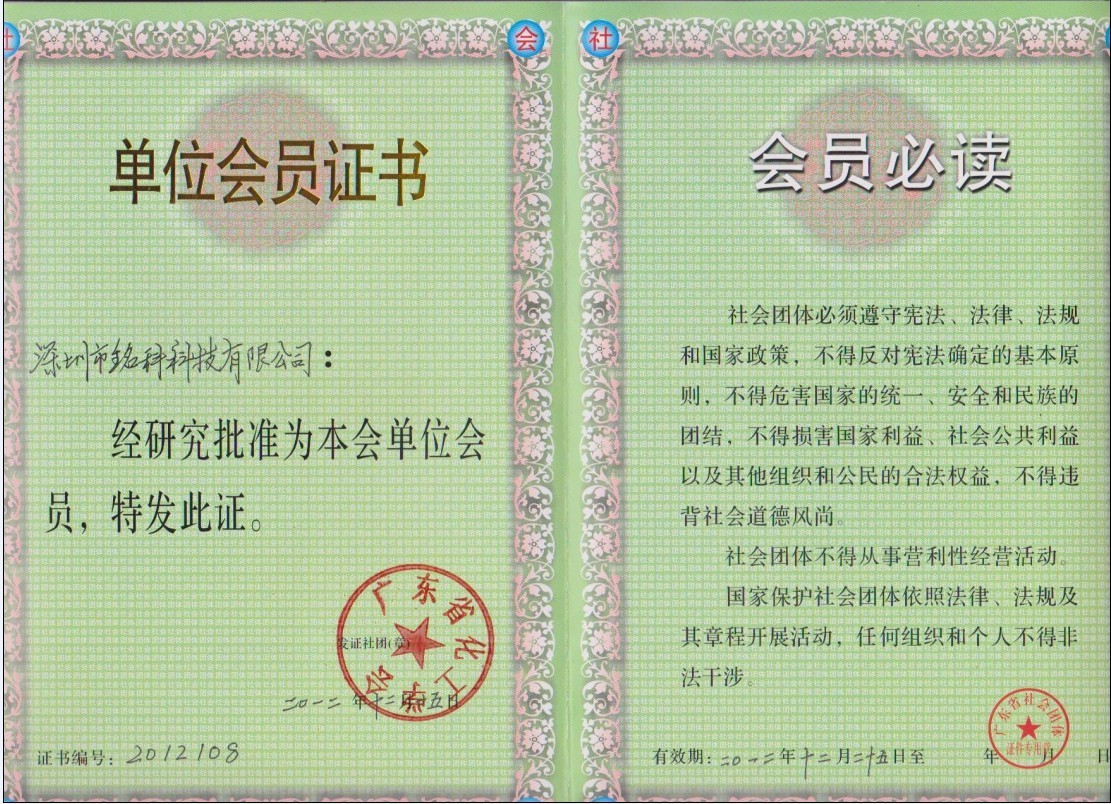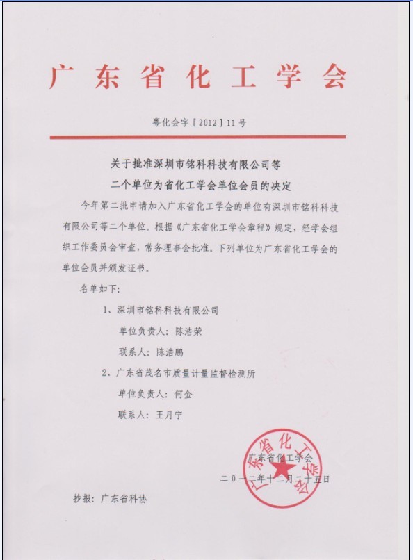 热烈庆祝深圳市铭科科技有限公司成为广东省化工学会会员,广东省化工学会以经济建设为中心,以促进化工科技进步和提高化工科技人才素质为宗旨,多年来广泛开展了国内外学术交流、推动“产、学、研”结合,协助政府部门开展规划调研,对企业咨询服务,为企业发展项目的调研和可行性研究等方面作了卓有成效的工作。几年来分别被评为中国科协的“学会之星”、广东省科协的“先进学会”、广东省民政厅的“先进民间组织”。
