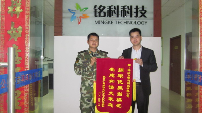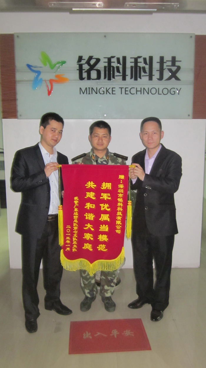 ,深圳市铭科科技有限公司荣获军民共建单位,2013年2月4日,武警广东总边防总队第七支队三大队官兵送来一面锦旗。”