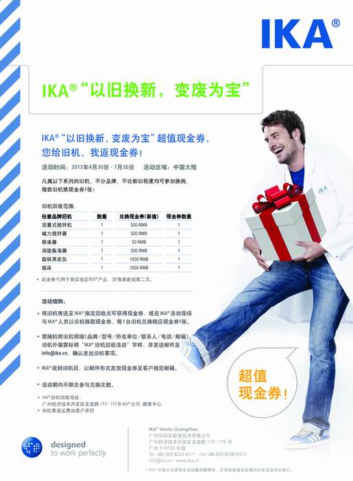 IKA®“以旧换新,变废为宝”超值现金券,现在开始派送啦!用任何一台IKA系列产品的旧机或者废弃机器,可换一张超值现金券,超值现金券可用于购买IKA系列产品作为抵消券使用。详情请看下图: