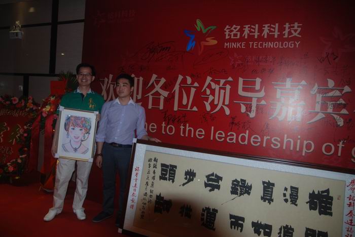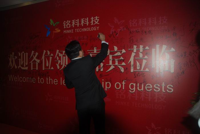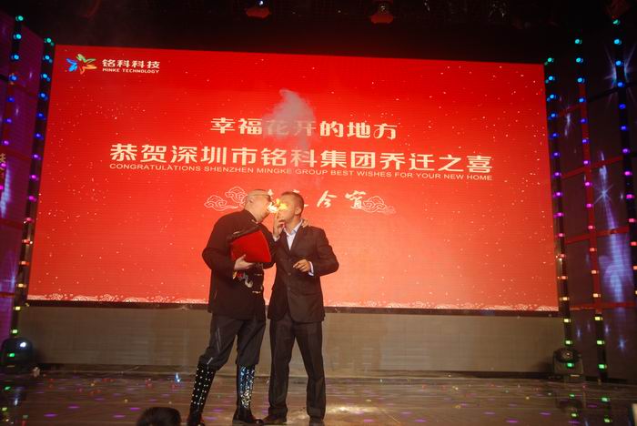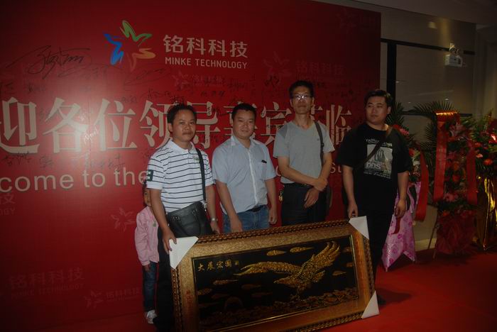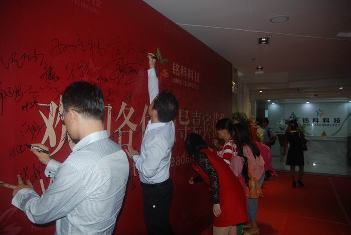 2013年10月26日,深圳市平湖华南城集团总经理、龙岗区副区长、平湖街道办主任、平湖派出所、武警边防部队领导、中国银行华南城支行行长等贵宾莅临铭科集团新址参观指导,对铭科近年来的迅猛发展大为赞赏。前来庆贺的100多家企业亲送花篮、绿植、牌匾祝贺铭科乔迁之喜,并在铭科乔迁墙上签名,祝愿铭科事业蒸蒸日上。