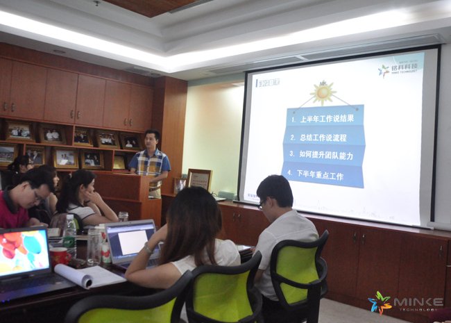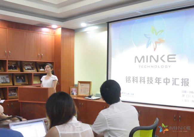 铭科科技2014年中会议在7月12日隆重召开,会议总共分为3个环节,第一个环节由各分、子公司、各部门经理进行工作汇报;第二个环节由总经理作总结发言;第三个环节是董事长对优秀员工进行表彰。